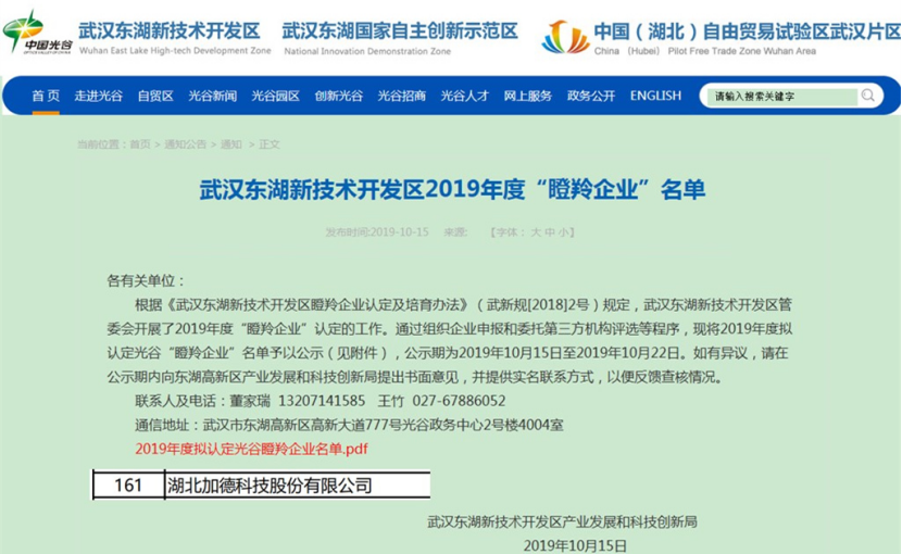 經武漢東湖新技術開發區管委會認定,湖北加德科技股份有限公司被評選為 2019 年度武漢市東湖區“瞪羚企業”榮譽稱號,這也是 2016 年公司初次參與評選以來,連續第四個年度榮獲此稱號 . 武漢東湖新技術開發區 是 國家級的高新技術開發區、國家自主創新示范區、大眾創業萬眾創新示范...MORE →