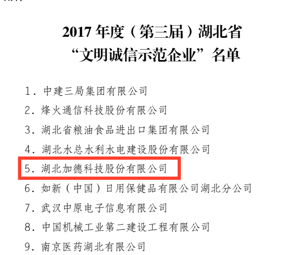 由中共湖北省委宣傳部、省文明辦、省工商局聯合開展的第三屆( 2017年度)湖北省 “文明誠信示范企業”創建活動中,我公司獲得第三屆(2017年度)湖北省 “文明誠信示范企業”榮譽稱號。 我司會再接再厲,以黨的十九大精神為指引,繼續積極踐行社會主義核心價值觀,在推進企業信用體系建...MORE →