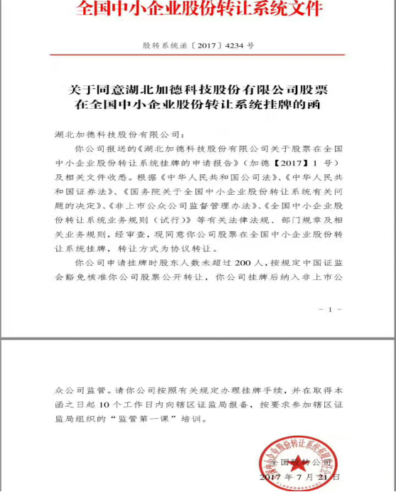 2017年7月21日,全國中小企業(yè)股轉(zhuǎn)系統(tǒng)顯示,湖北加德科技股份有限公司申請新三板掛牌已獲批準(zhǔn),公司正式掛牌上市新三板,股票代碼871784。