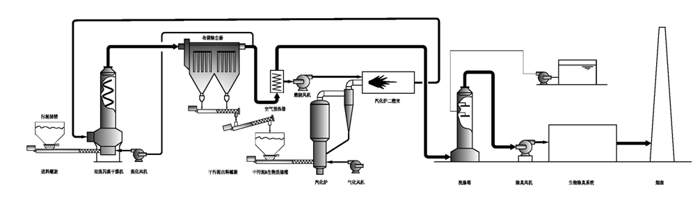 利用污泥自身熱值作為干燥熱源,能量不夠時(shí)采用生物質(zhì)作為補(bǔ)充,干燥后污泥進(jìn)入汽化爐進(jìn)行氣化,產(chǎn)生可燃燒氣體進(jìn)入燃燒室燃燒,高溫?zé)煔膺M(jìn)入干燥機(jī)對污泥進(jìn)行干燥,尾氣進(jìn)入后續(xù)尾氣處理單元,污泥氣化灰渣進(jìn)入作為建材原料售賣。