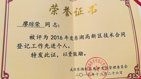武漢東湖新技術開發區作為國家級的高新技術開發區、國家自主創新示范區、大眾創業萬眾創新示范基地,一直積極推動高新技術企業科技成果轉化,力將東湖新技術開發區建成全國最開放、最活躍的技術交易市場。公司高度重視技術研發和企業創新,加強自身研發能力,在環保領域申請專利達40余項,獲得專利授權20項,并響應開發區的政策引領,積極探索科技成果市場化,加強技術合同備案登記工作。工作成果得到了東湖新技術開發區的認可,并獲得了表彰。