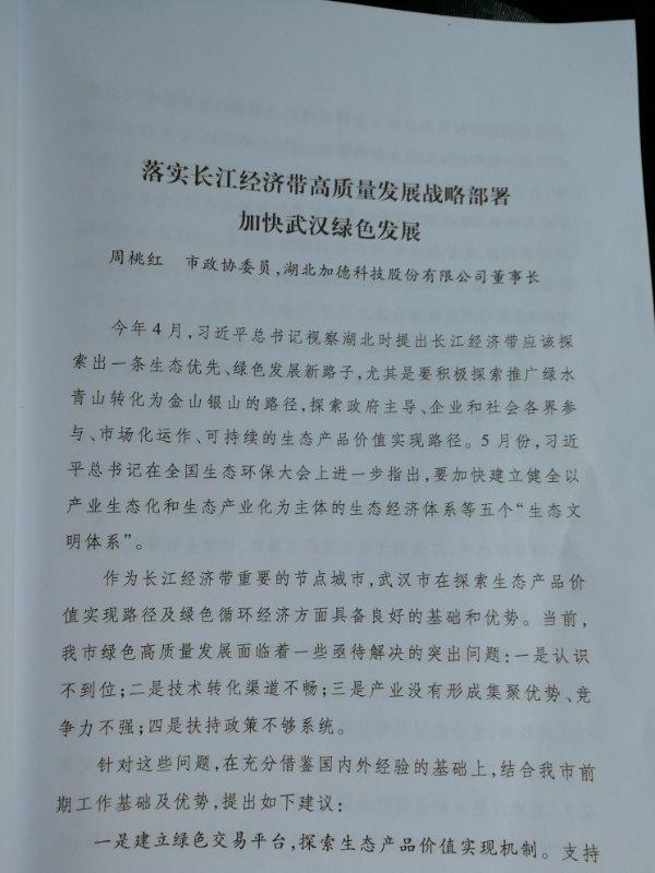 湖北加德科技股份有限公司董事長周桃紅作為武漢市政協代表應邀參加此次座談會,并作了題為《落實長江經濟高質量發展戰略部署,加快武漢綠色發展》的大會口頭發言。周桃紅董事長結合自己多年從業經驗和深入調研結果,指出:武漢作為長江經濟帶重要的節點城市,在探索生態產品價值實現路徑及綠色循環經濟方面具備良好的基礎和優勢。同時,周桃紅董事長也深入剖析了當前武漢綠色高質量發展面臨的一些亟待解決的突出問題:一是認識不到位;二是技術轉化渠道不暢;三是產業沒有形成集聚優勢、競爭力不強;四是扶持政策不夠系統。針對這些問題,周桃紅董事長在深入調研思考,并充分借鑒國內外經驗的基礎上,提出四點建議:一是建立綠色交易平臺,探索生態產品價值實現機制;二是建設長江國際低碳產業園,以點帶面發展綠色產業;三是實施武漢生態工業園區工程,促進環保產業化;四是設立“兩山綠色發展基金”,為產業落地提供金融支撐。