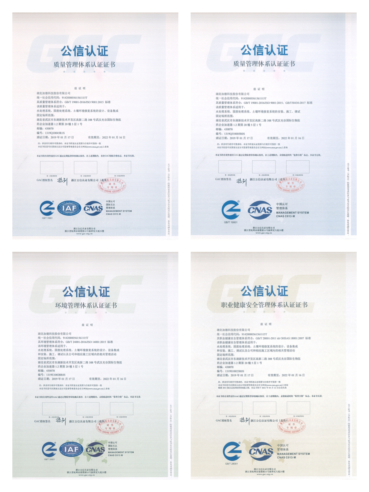 三項(xiàng)管理體系認(rèn)證證書的取得,是對(duì)公司各項(xiàng)管理工作的規(guī)范化、標(biāo)準(zhǔn)化的全面檢測(cè),對(duì)樹立湖北加德科技股份有限公司形象、提高公司標(biāo)準(zhǔn)化、規(guī)范化管理有著積極的推進(jìn)作用,是公司持續(xù)穩(wěn)定健康發(fā)展的重要保證。也證明加德公司有能力提供滿足法律法規(guī)和顧客要求的服務(wù),是一個(gè)對(duì)客戶、對(duì)社會(huì)、對(duì)員工和相關(guān)方負(fù)責(zé)任的優(yōu)質(zhì)企業(yè)。