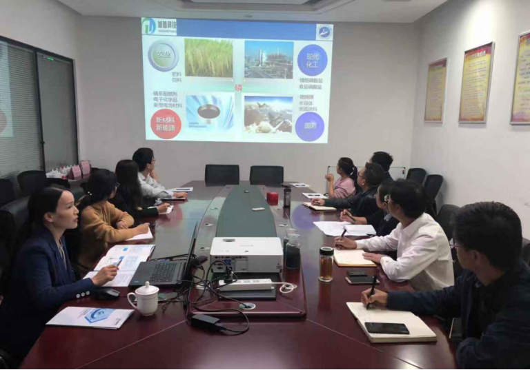會上,張教授首先介紹了磷資源現有的利用情況及所在課題組的磷尾礦及磷石膏處理工藝,著重介紹了課題組最新研究成果“磷礦浮選尾礦循環酸浸制備硫酸鈣晶須”,并與我司技術人員共同討論了磷尾礦、磷石膏研究進展及技術推廣利用過程中存在的問題。