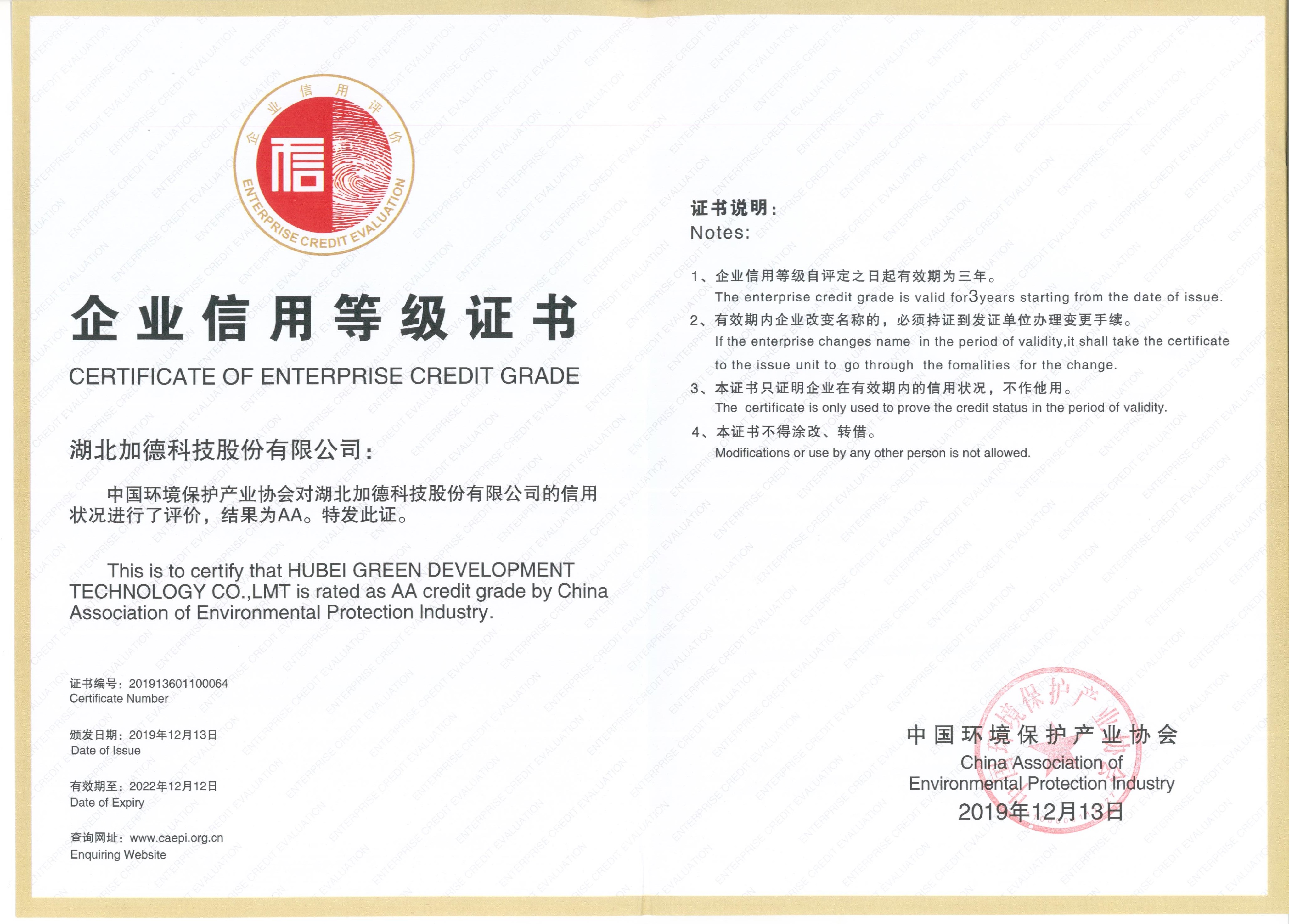 中國環境保護產業協會企業信用評價指標涵蓋企業的價值理念、管理能力、財務能力、市場能力、履約能力、社會責任和環境保護情況等要素。此AA信用評級的獲得,標志著我司綜合素質、管理水平、財務狀況、社會信用等多方面情況優良獲得環保行業業界肯定。