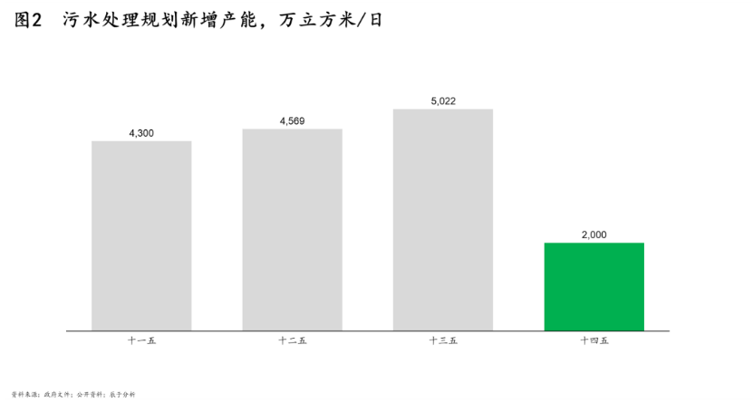 一是污水處理日漸成熟。近年我國城鎮(zhèn)污水處理任務(wù)已基本完成,城市污水處理率已經(jīng)達(dá)到95%以上,在“十四五”規(guī)劃中的污水處理新增產(chǎn)能也出現(xiàn)明顯下降(見圖2)。在污水處理漸趨飽和的情況下,先前遭到忽視的污泥處理問題重新得到關(guān)注。