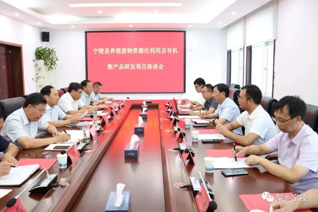 蔡勇在致辭中對(duì)周桃紅及項(xiàng)目研發(fā)團(tuán)隊(duì)成員一行到寧陵進(jìn)行考察研討表示歡迎,并簡(jiǎn)要介紹了寧陵縣情及農(nóng)業(yè)、畜牧業(yè)發(fā)展情況。蔡勇指出,寧陵畜牧業(yè)發(fā)展迅速,全縣現(xiàn)有出欄萬頭以上生豬養(yǎng)殖場(chǎng)28個(gè)、生豬養(yǎng)殖規(guī)模150萬頭,連續(xù)4年被評(píng)為“生豬調(diào)出大縣”,被認(rèn)定為河南省畜牧業(yè)高質(zhì)量發(fā)展示范縣,特別是已建成投產(chǎn)的牧原400萬頭生豬屠宰項(xiàng)目成為全國(guó)規(guī)模最大的現(xiàn)代化屠宰基地,形成了肉羊、肉鴿、肉雞、肉驢等一批規(guī)模較大的特色養(yǎng)殖企業(yè),打造了一批高質(zhì)量高品牌高效益養(yǎng)殖企業(yè)。同時(shí),寧陵擁有22萬畝金頂謝花酥梨,種植面積位于全國(guó)前三,是中國(guó)農(nóng)科院重點(diǎn)支持的種植基地。蔡勇指出,加快推進(jìn)畜禽養(yǎng)殖廢棄物資源化利用是踐行綠色發(fā)展理念的重要舉措,更是我縣作為農(nóng)業(yè)大縣、推進(jìn)畜禽養(yǎng)殖業(yè)轉(zhuǎn)型升級(jí)的必然要求。寧陵縣正在通過養(yǎng)殖、種植產(chǎn)業(yè)的迭代升級(jí),實(shí)現(xiàn)由傳統(tǒng)的養(yǎng)殖業(yè)向現(xiàn)代化的養(yǎng)殖業(yè),由無公害農(nóng)業(yè)向綠色農(nóng)業(yè)和生態(tài)農(nóng)業(yè)的發(fā)展,希望湖北加德科技有限公司及項(xiàng)目研發(fā)團(tuán)隊(duì)能圍繞本次座談主題出謀劃策、分享智慧、做好輔導(dǎo),寧陵將認(rèn)真吸納各位專家的真知灼見,虛心求教,期待雙方在養(yǎng)殖廢物資源化利用及有機(jī)梨產(chǎn)品研發(fā)項(xiàng)目領(lǐng)域開展合作,為寧陵畜牧產(chǎn)業(yè)高質(zhì)量發(fā)展以及環(huán)境保護(hù)工作做出貢獻(xiàn)。