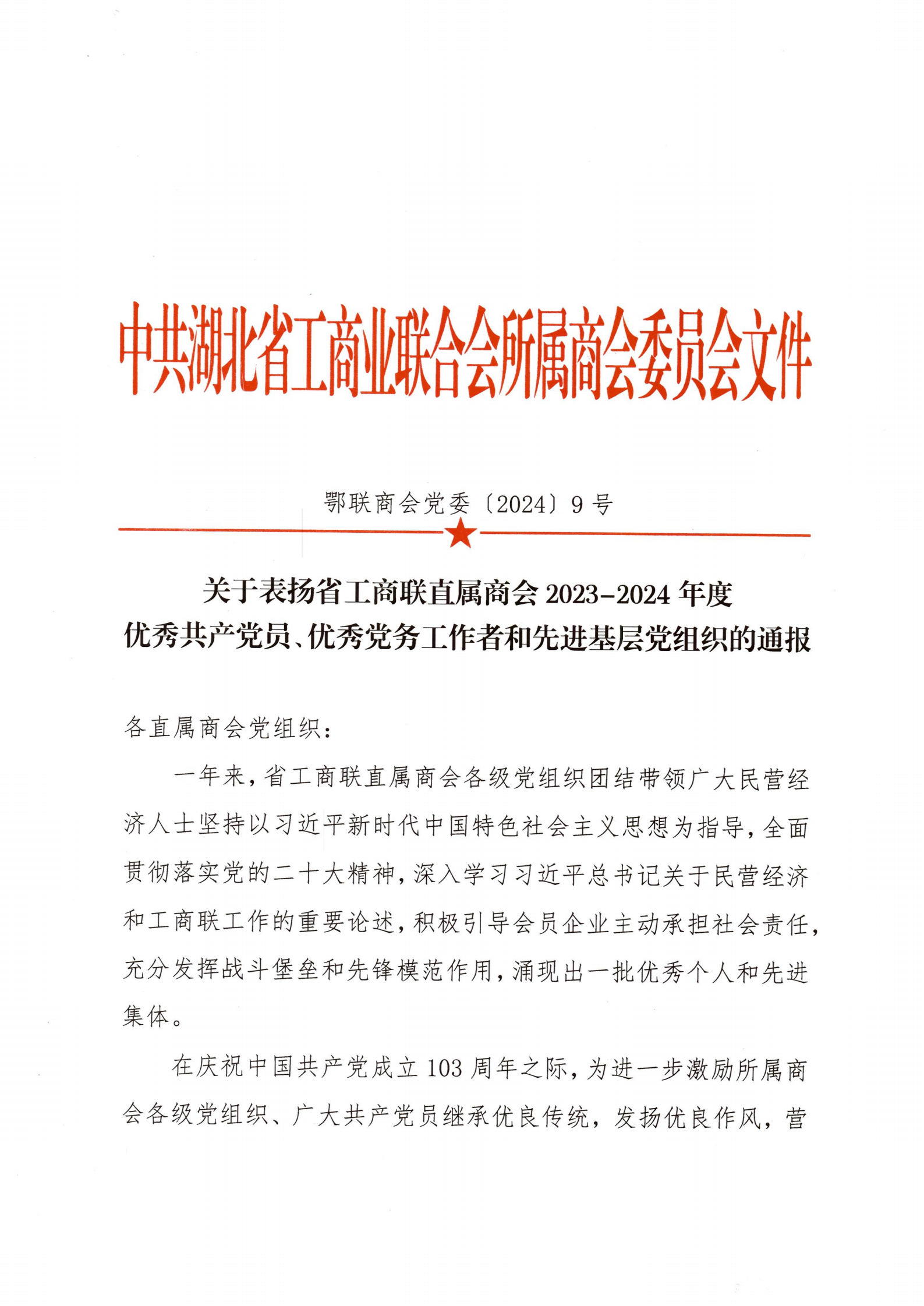 近日,在中國共產(chǎn)黨成立103周年之際,湖北加德科技股份有限公司獲評省工商聯(lián)直屬商會2023-2024年度先進基層黨組織。